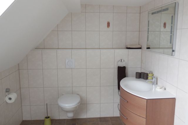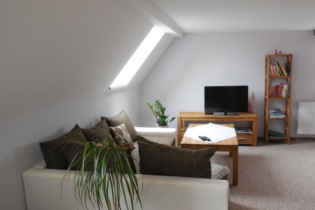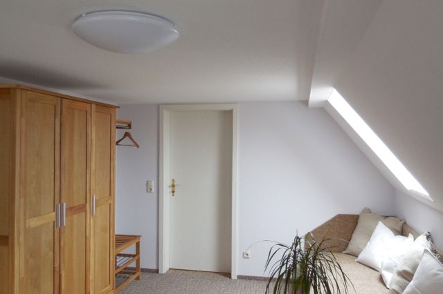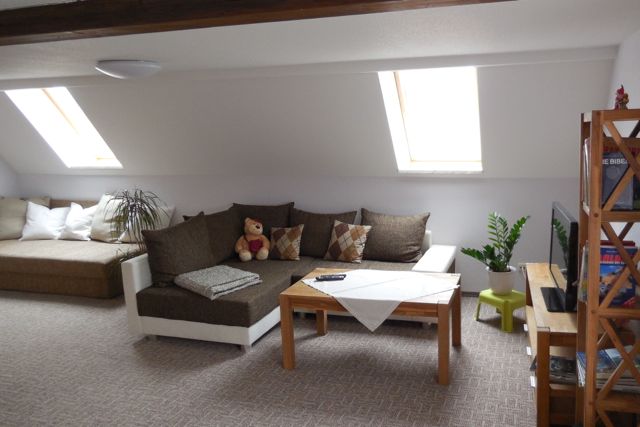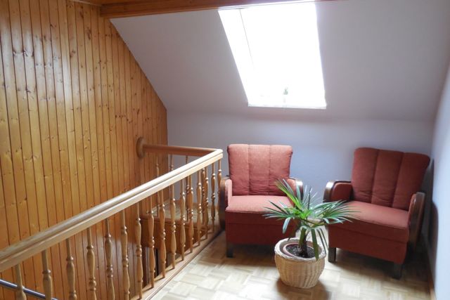 Im Dachgeschoss haben wir ein Gästezimmer (ca. 30 m2) liebevoll im bäuerlichen Stil, zusätzlich mit Sitzecke geschaffen. Neben der Möglichkeit in Ruhe zu entspannen gehört auch ein Flachbildfernseher zur Ausstattung. Es bietet mit seinen 2 Schlafplätzen, im Doppelbett, für zwei Erwachsene genügend Platz. Eine weitere Person könnte mit im Zimmer auf einem Schlafsofa Platz finden.
